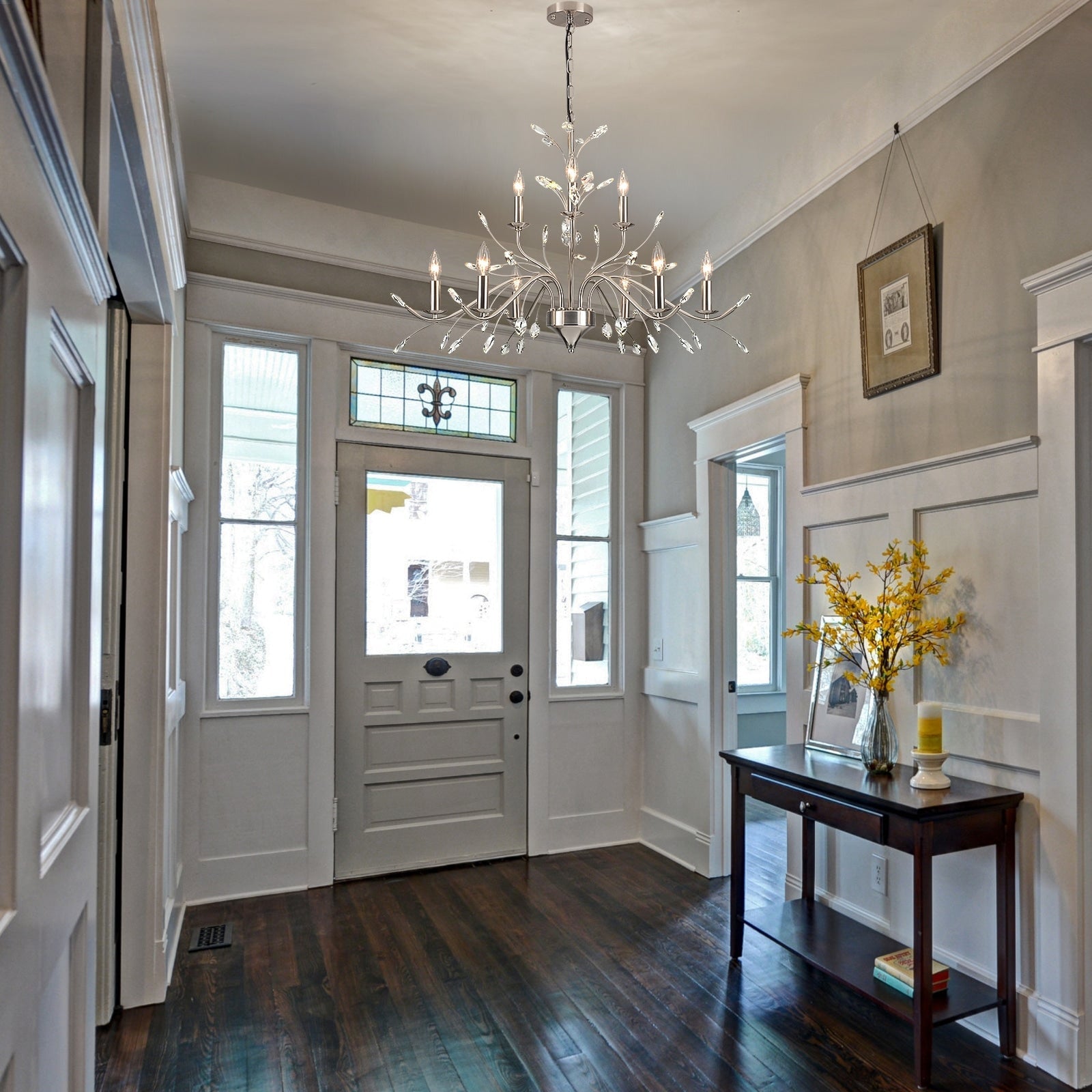 Enhance your home with the timeless elegance of this vintage crystal-accented branch chandelier. Featuring an intricate branch design with candle-style lights and sparkling crystal accents, this crystal chandelier adds a touch of sophistication and luxury to any room. The antique bronze finish or nickel finish and 9/21 lights provide a warm and inviting glow, perfect for larger spaces. Crafted from durable metal with an adjustable chain for customizable height, this chandelier combines style and functionality. Easy to install, it comes with all necessary hardware and detailed instructions.Transform your space with this stunning chandelier, perfect for creating a warm and inviting ambiance in any room.