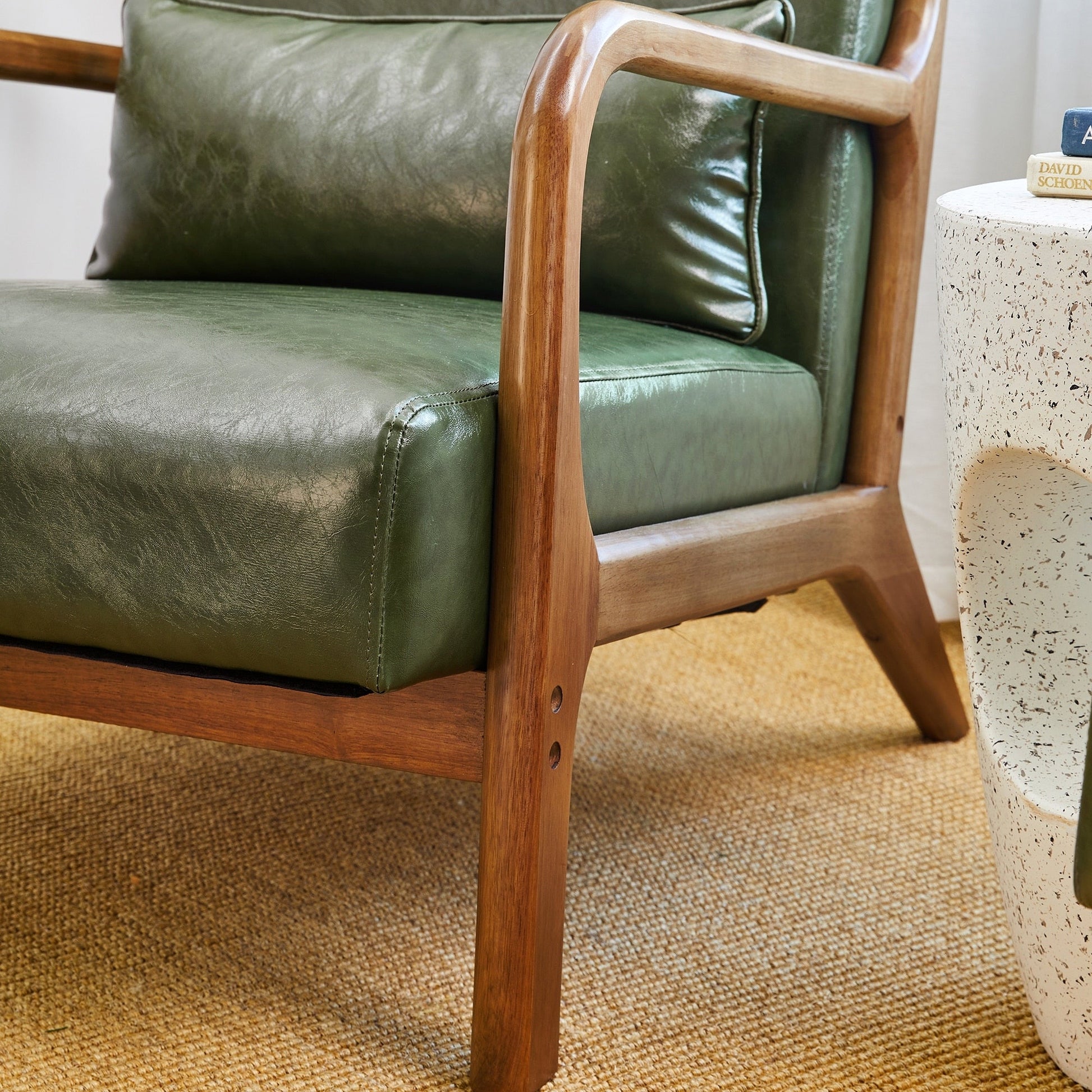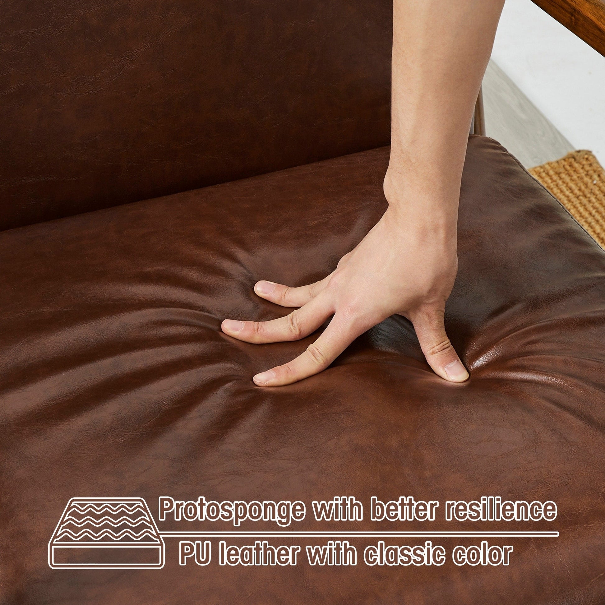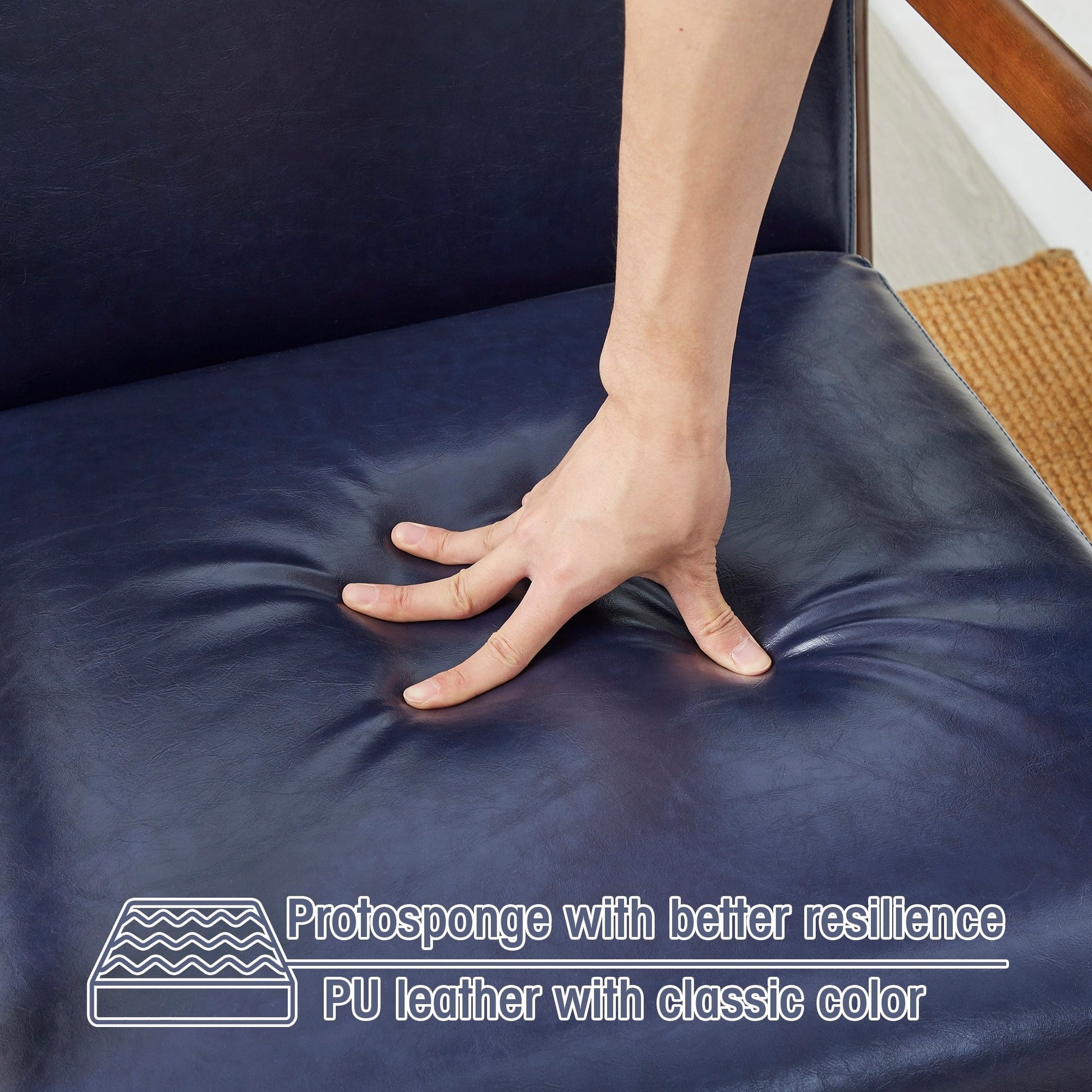 Add a touch of elegance and comfort to your home with the Mid-Century Modern PU Leather Accent Armchair. With a solid rubberwood frame and gorgeous walnut finish, this chair is built for long-lasting durability. The seat and back are upholstered in premium Leatherette leather with slight distressing, making it easy to clean, waterproof, and odor-free. This versatile accent chair is perfect for your living room, bedroom, reading area, or office.