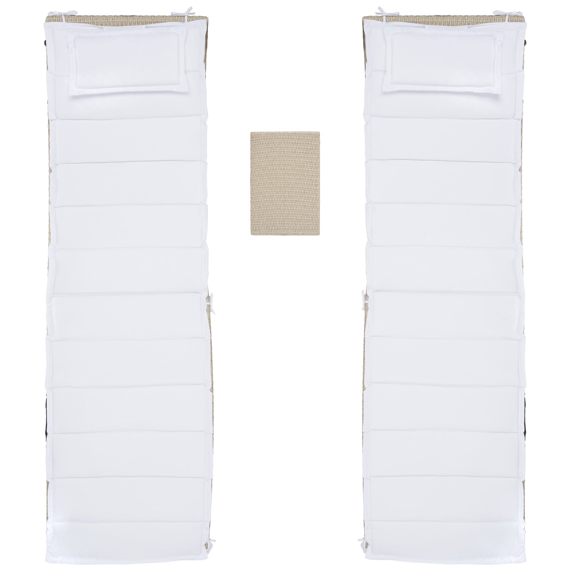 Luxuriate in the summer sun with this 3 Piece Sunlounger Set. The softly flowing elongated silhouettes of Carew's two PE rattan seats are perfectly topped with plush white cushions for maximum relaxation, and a matching end table is ideal for colorful drinks or fresh fruits.