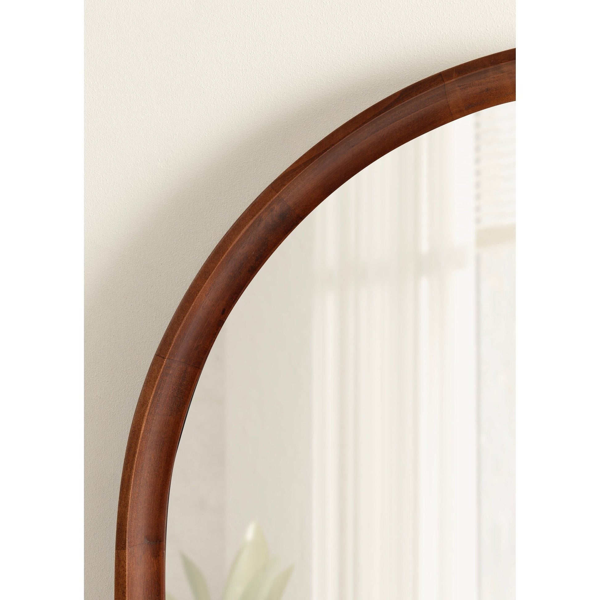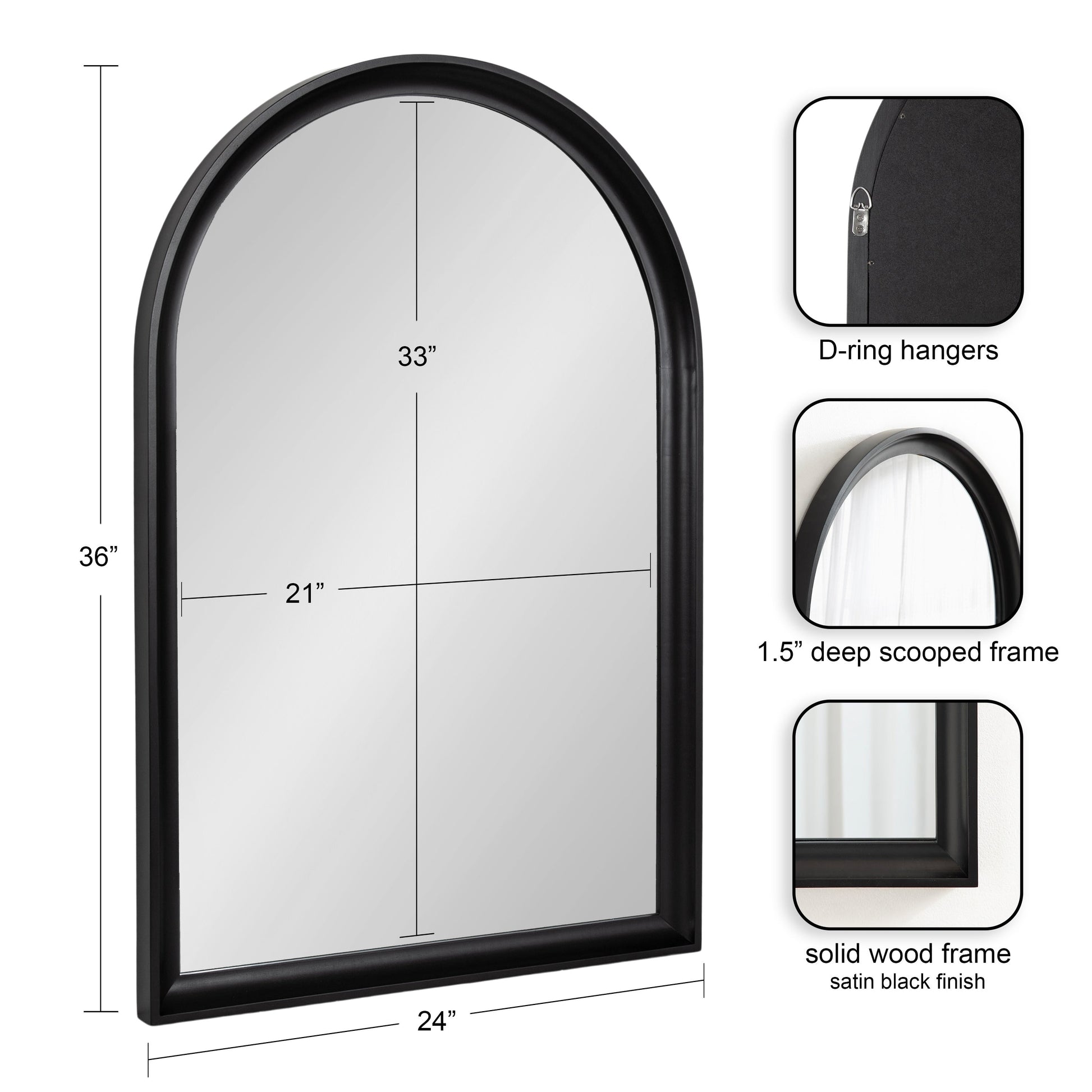 This mirror is perfect for unleashing your inner decorator and transforming your space with a modern transitional look. The Hatherleigh was designed with robust natural wood, providing high-quality durability, a lovely woodgrain, and a charming, rustic brown finish. The classic arch shape is perfect for introducing soft geometry to your space while maintaining a squared-off base for structure and uniformity. Its overall dimensions are 24 inches wide by 1.5 inches deep by 36 inches tall, creating a commanding statement piece that functions well in various spaces. Use the Hatherleigh mirror to bring vibrancy to your space, using the wide surface area to increase the spread of light and make your room appear brighter. It looks great all throughout your home or office, pairing well with your mantel, console table, sofa, bed, and much more. If you're looking to start renovating your bathroom with a relaxing vibe, the Hatherleigh works well as a tall bathroom mirror in a single or double vanity. Hang this mirror in a matter of minutes with the metal D-ring hangers that are attached to the sturdy back.